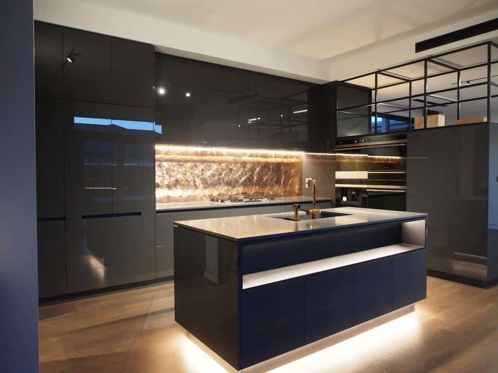 Copper and Glass Kitchen splashback. Using the very latest in glass technology we are pleased to demonstrate the exceptional effects which are available to our clients. This particular finish is used on walls and doors and are suited to both internal and external applications. Also available in silver and gold