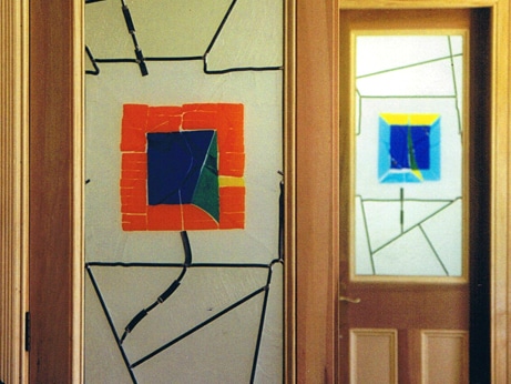 Hot, vibrant and unorthodox are all words which can describe these panels. Lead can be a cumbersome prerequisite but here changes of thickness occur in a single line of lead, echoing the structure of the central fused panel.