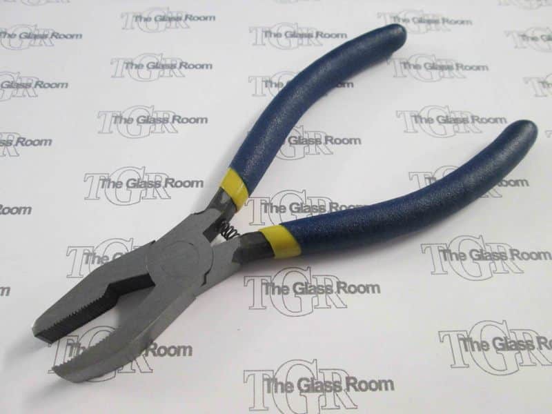 Grozier Pliers/Breaker are dual purpose pliers with a flat jaw and a curved jaw. Both jaws are serrated for removing flares and tiny points of glass or nibbling the glass it to the size you want. If you don’t have a grinder this is your tool to fix up your glass pieces.