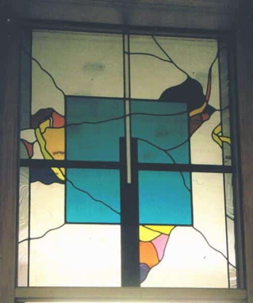 This leadlight has a strong symbolic presence with the use of lead not just to join the glass pieces together but as a major part of the design
