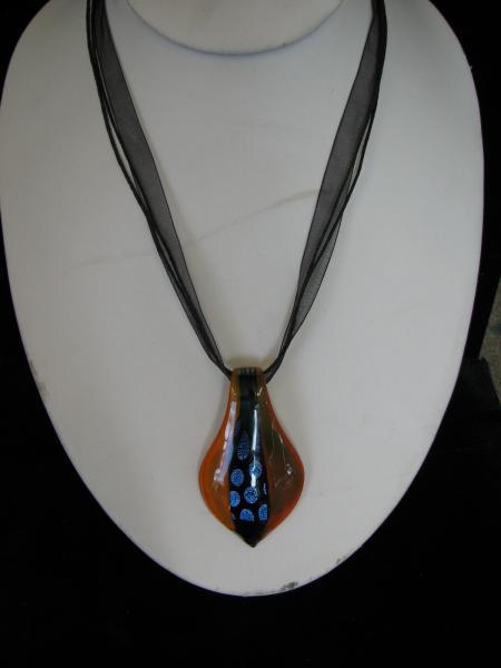 This glass pendant is a beautiful rich orange colour. The strip down the centre is dichroic glass which picks up the light and shines beautiful colours. The pendant is on ribbon and cord with adjustable silver clasp.The cord measures 440mm long with an additional 50mm extension chain.