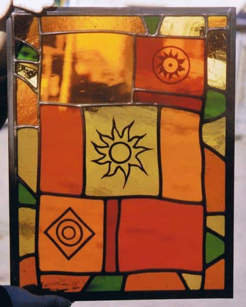 This window is a combination of leadlight and stained glass. Simple forms, hot colours combined with superb glasses and superb craftsmanship have produced a wonderfully charming stained glass window. The symbols are painted in the traditional stained glass methods and fired in a glass kiln to ensure a permanent finish.